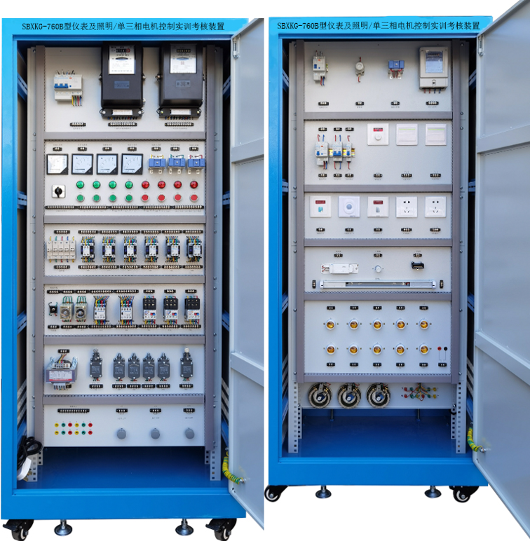 柜式電工電拖實(shí)訓(xùn)設(shè)備,電工電器實(shí)訓(xùn)考核柜,電工電拖實(shí)訓(xùn)考核裝置是按照勞動(dòng)社會(huì)保障部頒發(fā)的工人技術(shù)等級(jí)標(biāo)準(zhǔn)和職業(yè)技能實(shí)驗(yàn)內(nèi)容要求教學(xué)而設(shè)計(jì),電工實(shí)訓(xùn)考核柜以標(biāo)準(zhǔn)的電氣控制柜為主,利用柜體的雙面空間,布置電器及配套實(shí)驗(yàn)器材,能完成電工考核鑒定中的電工電器控制與照明電路的實(shí)操項(xiàng)目,堅(jiān)持理論與實(shí)際的原則,突出技能訓(xùn)練,提高了實(shí)習(xí)教學(xué)質(zhì)量,讓學(xué)員很快掌握實(shí)際操作技能知識(shí)與實(shí)踐接線技巧,使培訓(xùn)教學(xué)走向一個(gè)新領(lǐng)域。